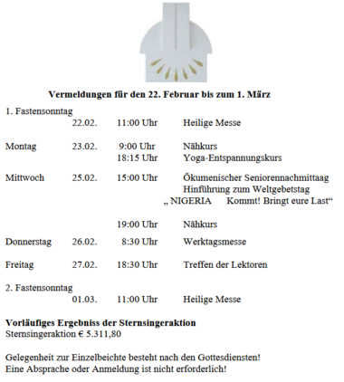 Start > Hauptnavigation > Neues von uns > News > Vermeldungen für die Zeit vom 15. bis zum 22. Februar 2026