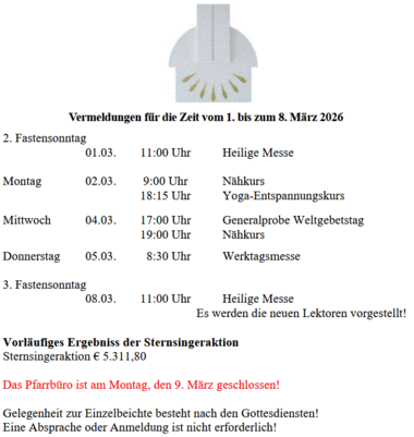 Start > Hauptnavigation > Neues von uns > News > Vermeldungen für die Zeit vom 1. bis zum 8. März 2026