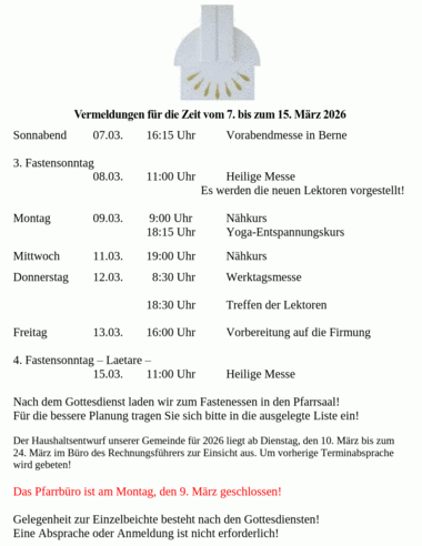 Vermeldungen für die Zeit vom 7. bis zum 15. März 2026